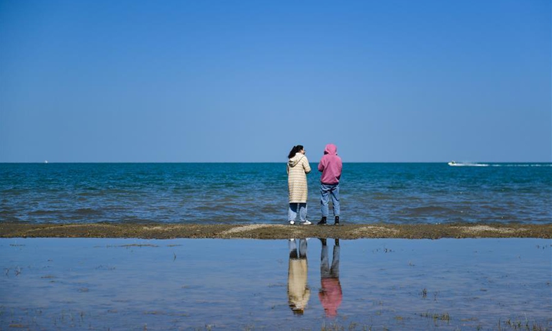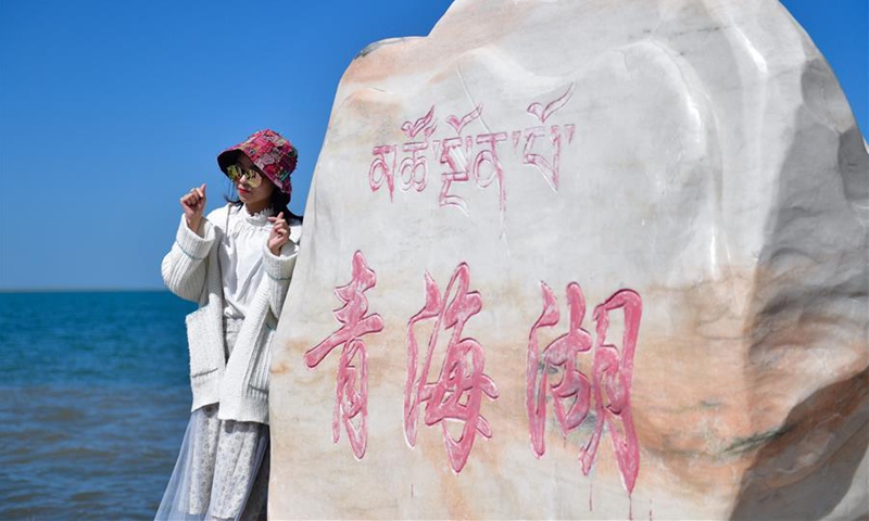 People visit Qinghai Lake in northwest China's Qinghai Province, Sept. 23, 2020. Thanks to the Qinghai-Tibet Railway and its extension railways, many tourist attractions in the province have been connected, which significantly promoted the tourism industry here and helped locals increase income. (Xinhua/Zhang Long)
