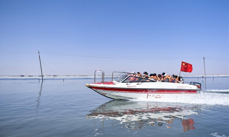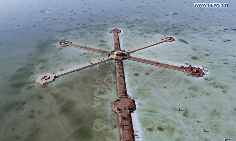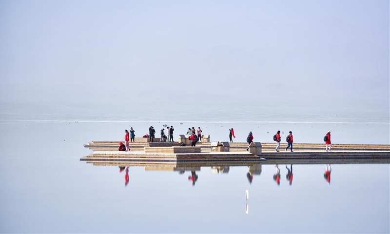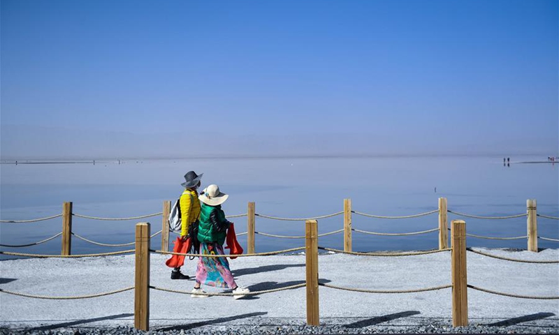 People visit Caka Salt Lake in Wulan County of northwest China's Qinghai Province, Sept. 23, 2020. Thanks to the Qinghai-Tibet Railway and its extension railways, many tourist attractions in the province have been connected, which significantly promoted the tourism industry here and helped locals increase income. (Xinhua/Zhang Long)