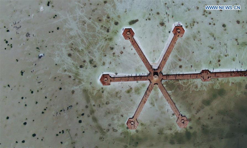 Aerial photo taken on Sept. 23, 2020 shows a view of Caka Salt Lake in Wulan County, northwest China's Qinghai Province. Thanks to the Qinghai-Tibet Railway and its extension railways, many tourist attractions in the province have been connected, which significantly promoted the tourism industry here and helped locals increase income. (Xinhua/Zhang Long)
