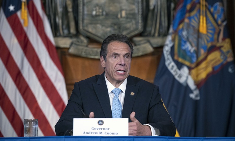 New York State Governor Andrew Cuomo provides a coronavirus update during a press briefing in Albany of New York State, the United States, May 15, 2020. (Mike Groll/Office of Governor Andrew M. Cuomo/Handout via Xinhua)