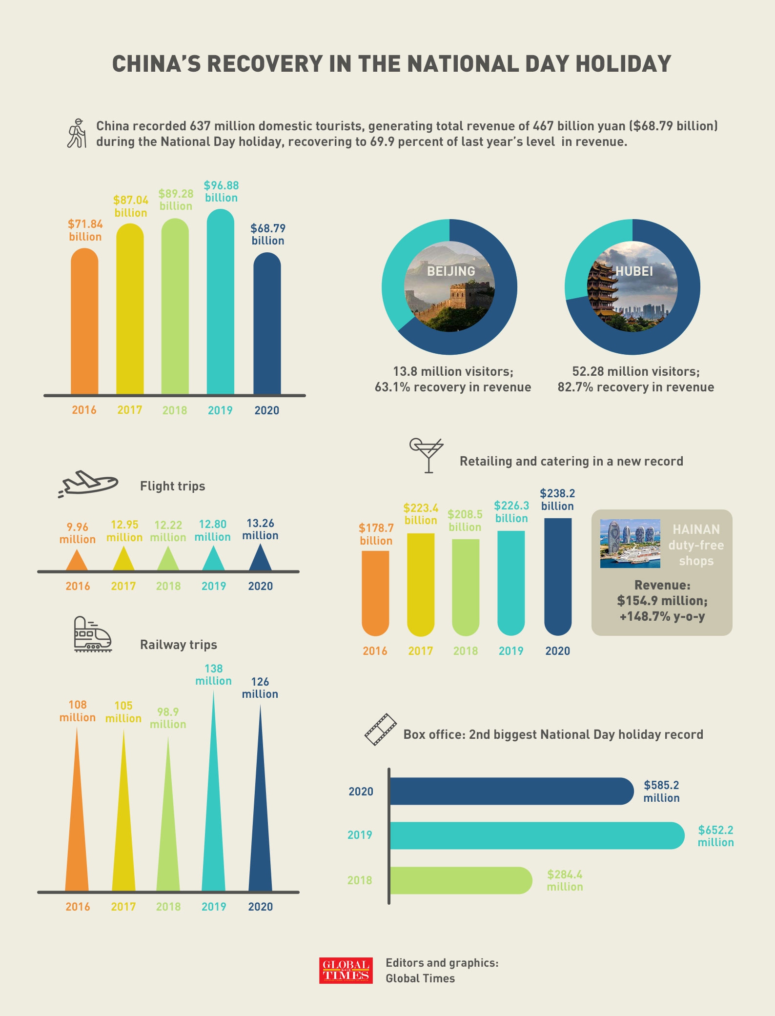 China also recorded 637 million domestic tourists during the holiday season, reaching 79 percent of last year's level. It was an improvement over the 48.81 million visitors during the three-day Dragon Boat Festival in June, which represented only 50.9 percent of last year's level.