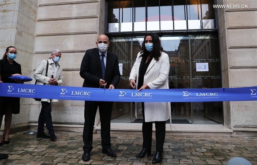 Merouane Debbah (2nd R), director of the R&D Center of Huawei France, attends a ribbon-cutting ceremony of Huawei's sixth research center in France, in Paris, Oct. 9, 2020. Chinese tech giant Huawei opened here on Friday the research center dedicated to fundamental research in mathematics and computing. (Xinhua/Gao Jing)