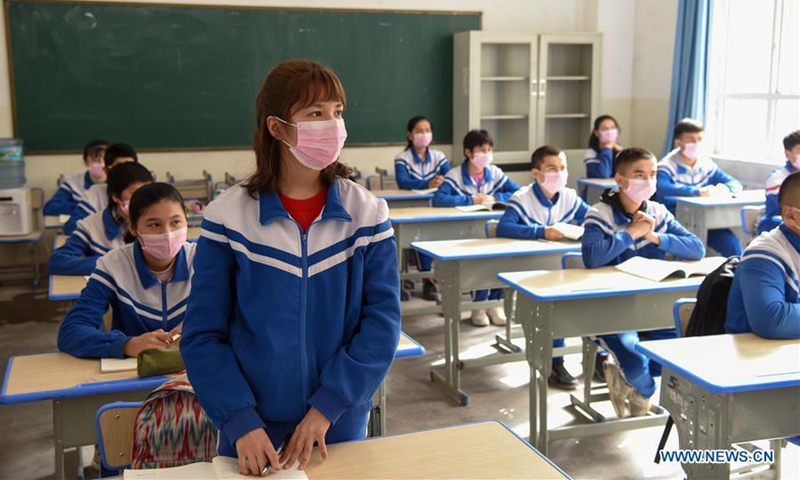 Students have a math class at a middle school in Kashgar, northwest China's Xinjiang Uygur Autonomous Region, March 16, 2020. Thanks to strenuous efforts from all sides, major progress has been achieved in Xinjiang. From 2014 to 2019, a sound economic momentum was sustained with an average annual GDP growth rate of 7.2 percent. Living standards of the local people have significantly improved with an average yearly growth of 9.1 percent in residential per capita disposable income, and more than 2.92 million out of the 3.09 million registered as impoverished people shook off poverty. (Xinhua/Ding Lei)