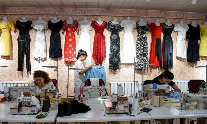 Workers make clothes at a clothing sewing cooperative at Daxi Village in Yuli County, northwest China's Xinjiang Uygur Autonomous Region, Sept. 4, 2020. Thanks to strenuous efforts from all sides, major progress has been achieved in Xinjiang. From 2014 to 2019, a sound economic momentum was sustained with an average annual GDP growth rate of 7.2 percent. Living standards of the local people have significantly improved with an average yearly growth of 9.1 percent in residential per capita disposable income, and more than 2.92 million out of the 3.09 million registered as impoverished people shook off poverty. (Xinhua/Ding Lei)