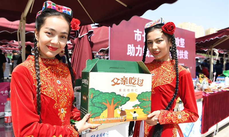 Girls display local specialities during a live-streaming activity at a jade trading center in Hotan, northwest China's Xinjiang Uygur Autonomous Region, May 27, 2020. Thanks to strenuous efforts from all sides, major progress has been achieved in Xinjiang. From 2014 to 2019, a sound economic momentum was sustained with an average annual GDP growth rate of 7.2 percent. Living standards of the local people have significantly improved with an average yearly growth of 9.1 percent in residential per capita disposable income, and more than 2.92 million out of the 3.09 million registered as impoverished people shook off poverty. (Xinhua/Sadat)