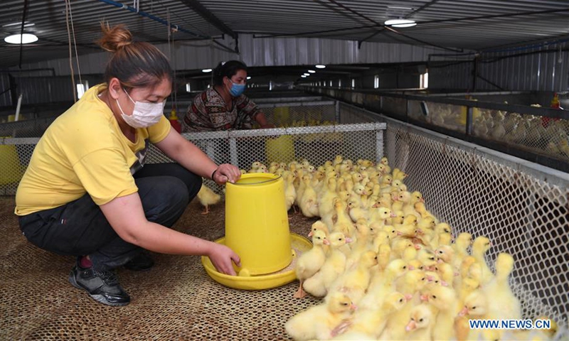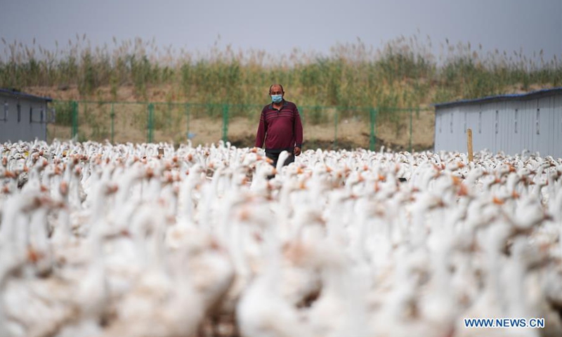 A worker checks the growth of geese at a goose incubation base in Yutian County, northwest China's Xinjiang Uygur Autonomous Region, May 19, 2020. Thanks to strenuous efforts from all sides, major progress has been achieved in Xinjiang. From 2014 to 2019, a sound economic momentum was sustained with an average annual GDP growth rate of 7.2 percent. Living standards of the local people have significantly improved with an average yearly growth of 9.1 percent in residential per capita disposable income, and more than 2.92 million out of the 3.09 million registered as impoverished people shook off poverty. (Xinhua/Sadat)