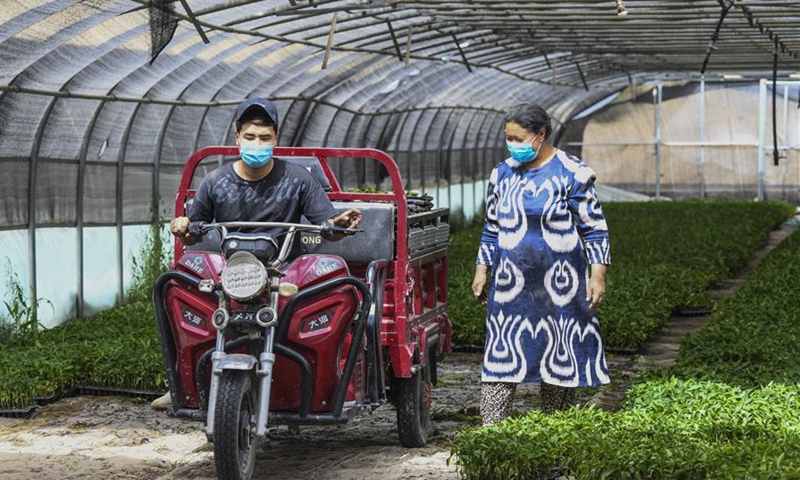 Villagers transport chili seedlings in a greenhouse in Tawakkul Township of Hotan County, northwest China's Xinjiang Uygur Autonomous Region, May 16, 2020. Thanks to strenuous efforts from all sides, major progress has been achieved in Xinjiang. From 2014 to 2019, a sound economic momentum was sustained with an average annual GDP growth rate of 7.2 percent. Living standards of the local people have significantly improved with an average yearly growth of 9.1 percent in residential per capita disposable income, and more than 2.92 million out of the 3.09 million registered as impoverished people shook off poverty. (Xinhua/Wang Fei)