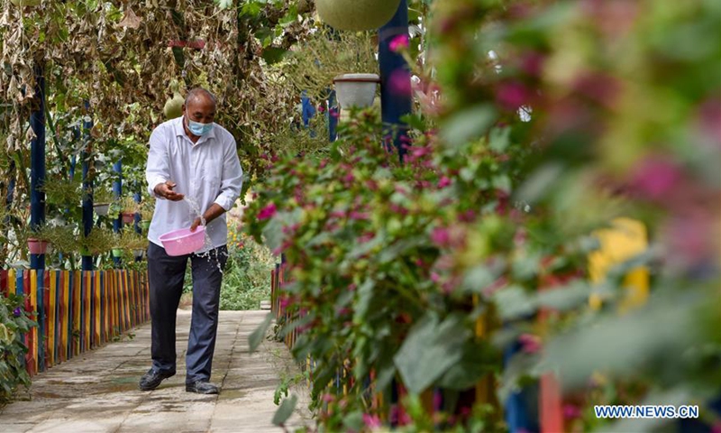 A villager cleans up his yard at Daxi Village in Yuli County, northwest China's Xinjiang Uygur Autonomous Region, Sept. 4, 2020. Thanks to strenuous efforts from all sides, major progress has been achieved in Xinjiang. From 2014 to 2019, a sound economic momentum was sustained with an average annual GDP growth rate of 7.2 percent. Living standards of the local people have significantly improved with an average yearly growth of 9.1 percent in residential per capita disposable income, and more than 2.92 million out of the 3.09 million registered as impoverished people shook off poverty. (Xinhua/Ding Lei)