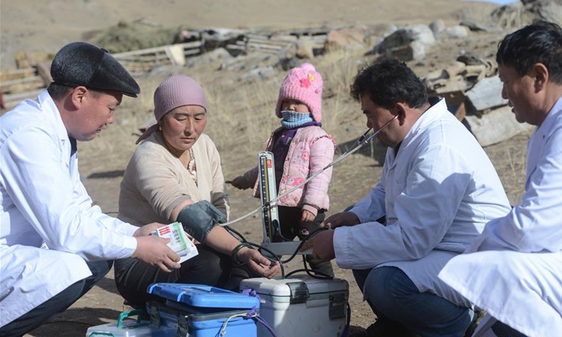 Medical workers help measure blood pressure for a shepherd on a pasture in Zhaosu County, northwest China's Xinjiang Uygur Autonomous Region, Jan. 31, 2019. Thanks to strenuous efforts from all sides, major progress has been achieved in Xinjiang. From 2014 to 2019, a sound economic momentum was sustained with an average annual GDP growth rate of 7.2 percent. Living standards of the local people have significantly improved with an average yearly growth of 9.1 percent in residential per capita disposable income, and more than 2.92 million out of the 3.09 million registered as impoverished people shook off poverty. (Xinhua/Ding Lei)