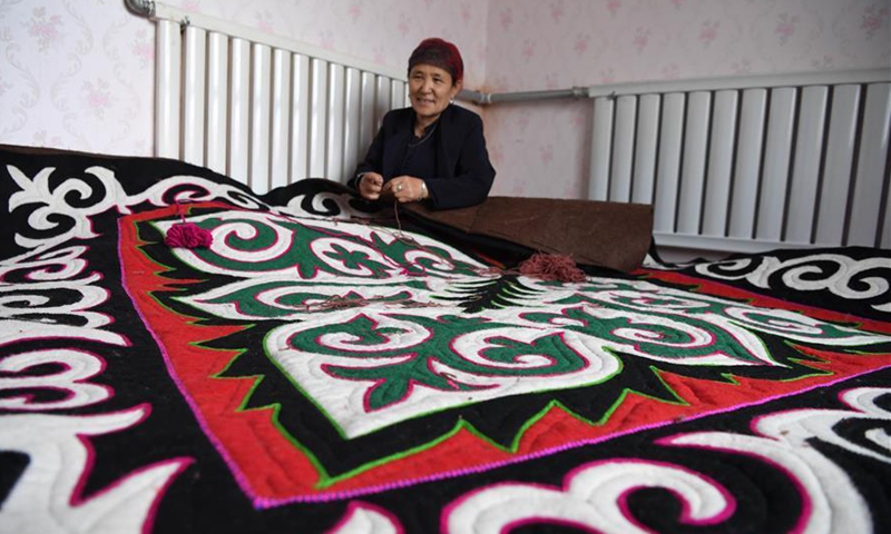 A villager makes textile at an embroidery cooperative in Tekes County, northwest China's Xinjiang Uygur Autonomous Region, July 3, 2020. Thanks to strenuous efforts from all sides, major progress has been achieved in Xinjiang. From 2014 to 2019, a sound economic momentum was sustained with an average annual GDP growth rate of 7.2 percent. Living standards of the local people have significantly improved with an average yearly growth of 9.1 percent in residential per capita disposable income, and more than 2.92 million out of the 3.09 million registered as impoverished people shook off poverty. (Xinhua/Wang Fei)