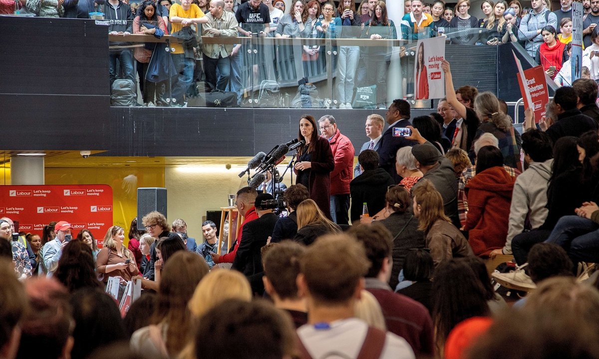 New Zealand's Prime Minister Jacinda Ardern (center) speaks to the students while campaigning at Victoria University in Wellington on Tuesday, ahead of the country's general election on Saturday. Photo: AFP