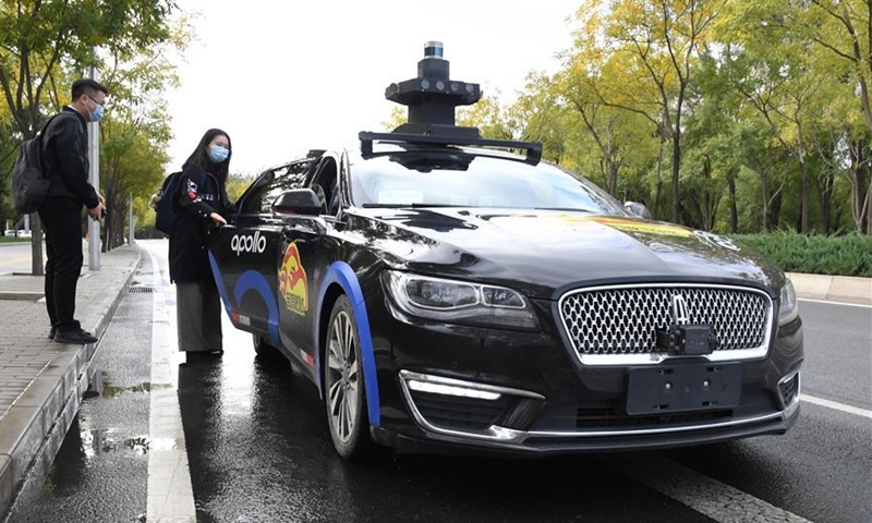 A woman takes a self-driving taxi at an appointed location on the Daoxianghu Road in Haidian District of Beijing, capital of China, Oct. 14, 2020. China's internet giant Baidu has launched a program in Beijing to offer free trials of its self-driving taxi service from Saturday. The pilot service, which serves certain stops in a part of the city from 10 a.m. to 4 p.m., will operate until Nov. 6, according to Baidu. (Xinhua/Ren Chao)