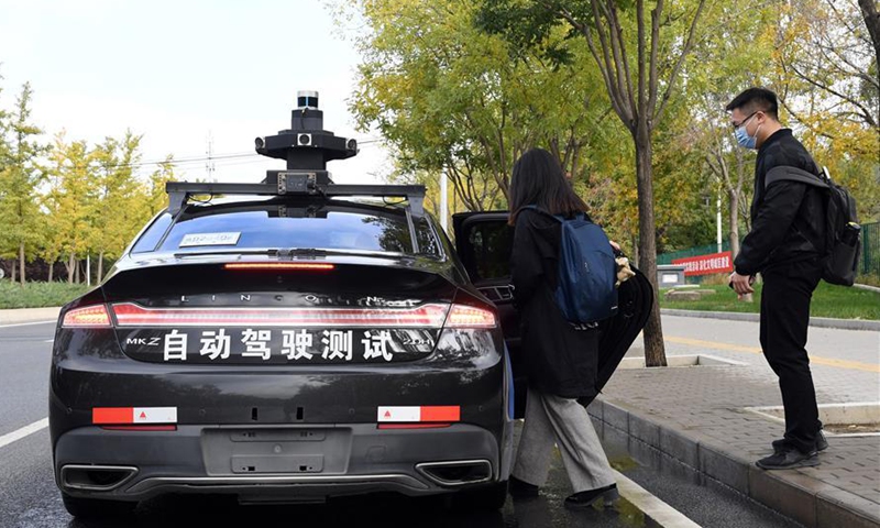 A self-driving taxi arrives at an appointed location on the Daoxianghu Road in Haidian District of Beijing, capital of China, Oct. 14, 2020. China's internet giant Baidu has launched a program in Beijing to offer free trials of its self-driving taxi service from Saturday. The pilot service, which serves certain stops in a part of the city from 10 a.m. to 4 p.m., will operate until Nov. 6, according to Baidu. (Xinhua/Ren Chao)