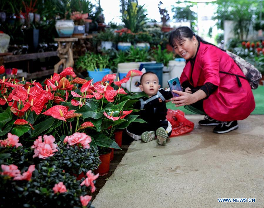 A woman takes a selfie with her son during the Changxing flower and tree fair in Sian Town of Changxing County, east China's Zhejiang Province, Oct. 16, 2020. The Changxing flower and tree fair, exhibiting more than 1,000 species of flowers and trees, kicked off in Sian Town of Changxing on Friday. With the planting area of flowers and trees reaching 283,000 mu (about 18,867 hectares), the flower and tree business in Changxing has achieved a sales volume of nearly two billion yuan (about 298.6 million U.S. dollars) from January to September. (Xinhua/Xu Yu)