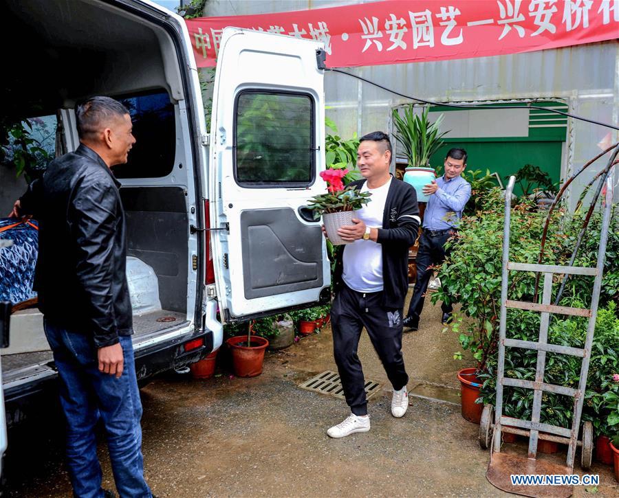 Customers transfer newly-purchased flowers and seedlings onto a vehicle during the Changxing flower and tree fair in Sian Town of Changxing County, east China's Zhejiang Province, Oct. 16, 2020. The Changxing flower and tree fair, exhibiting more than 1,000 species of flowers and trees, kicked off in Sian Town of Changxing on Friday. With the planting area of flowers and trees reaching 283,000 mu (about 18,867 hectares), the flower and tree business in Changxing has achieved a sales volume of nearly two billion yuan (about 298.6 million U.S. dollars) from January to September. (Xinhua/Xu Yu)