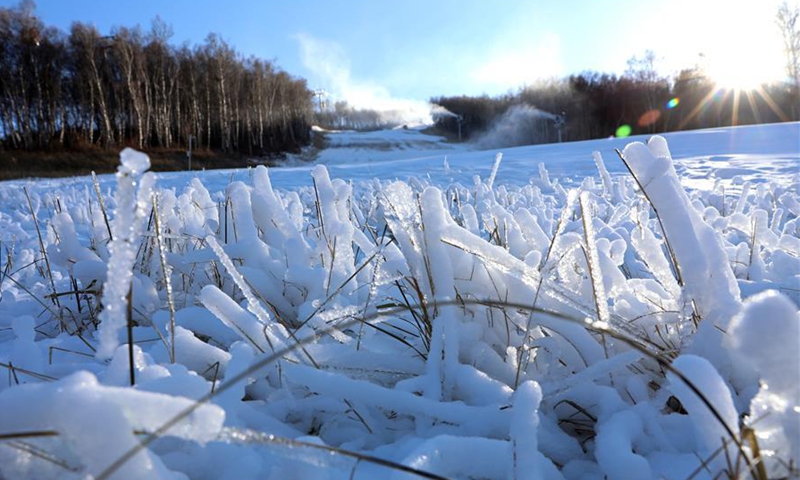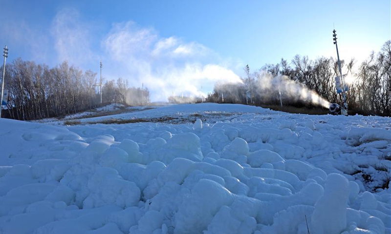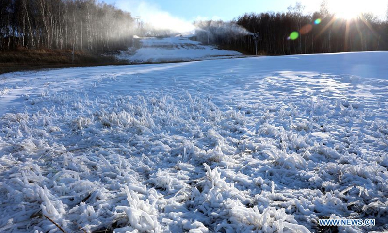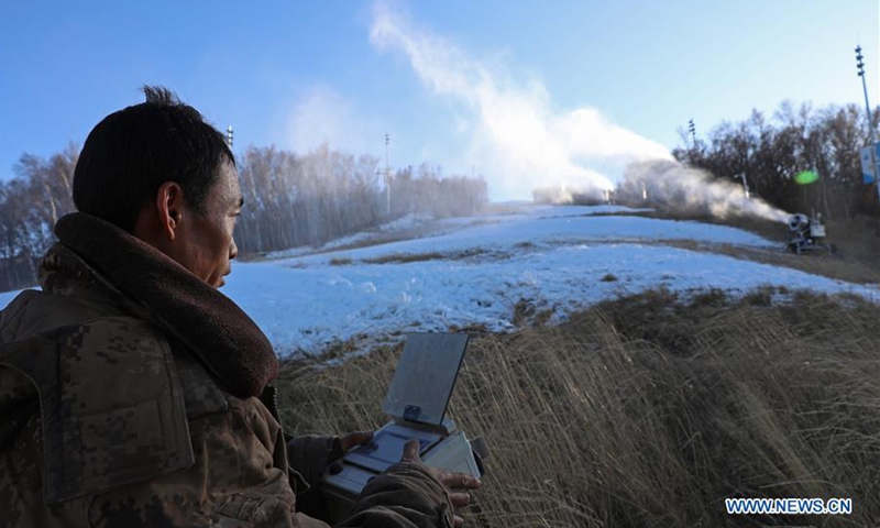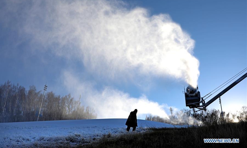 A staff member operates snowmaking machines at a ski field in Chongli District of Zhangjiakou City, north China's Hebei Province, Oct. 17, 2020. Ski fields in Chongli are getting ready for the skiing season as the temperature drops these days. (Photo by Wu Diansen/Xinhua)