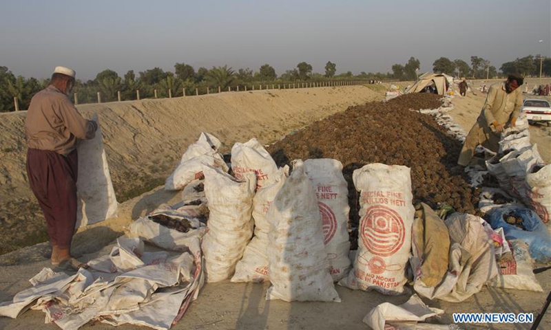 Afghan farmers pack pine nuts at a field in Jalalabad city, Nangarhar province, Afghanistan, Oct. 17, 2020. (Photo by Saifurahaman Safi/Xinhua)