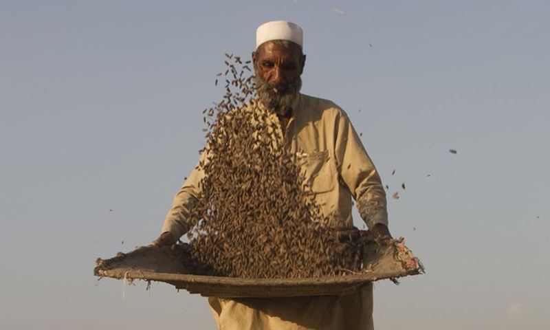 An Afghan farmer harvests pine nuts at a field in Jalalabad city, Nangarhar province, Afghanistan, Oct.17,2020. (Photo by Saifurahaman Safi/Xinhua)