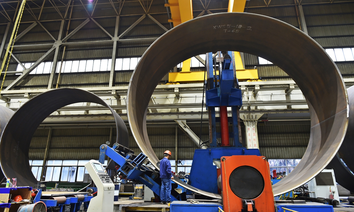 Workers process monopile cylinders for generating sea-based wind power in Zhangzhou, East China's Fujian Province on Monday. The city has unique conditions such as its port and shipping, resource advantages of the far-reaching offshore wind power industry, and business environment services. Photo: cnsphoto