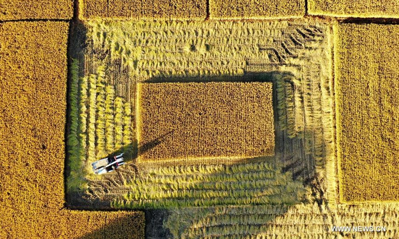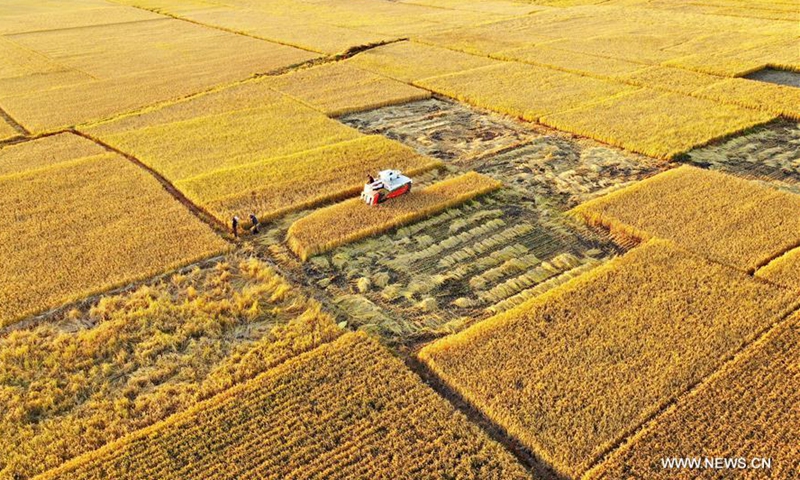 Aerial photo taken on Oct. 18, 2020 shows farmers harvesting rice in Jiangzhuang Village in Luanzhou, north China's Hebei Province. (Xinhua/Mu Yu)