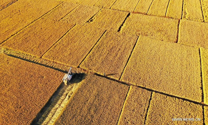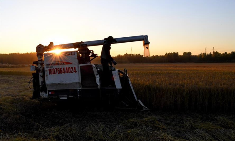 A farmer drives a harvester at a rice field in Jiangzhuang Village in Luanzhou, north China's Hebei Province, Oct. 18, 2020. (Xinhua/Mu Yu)