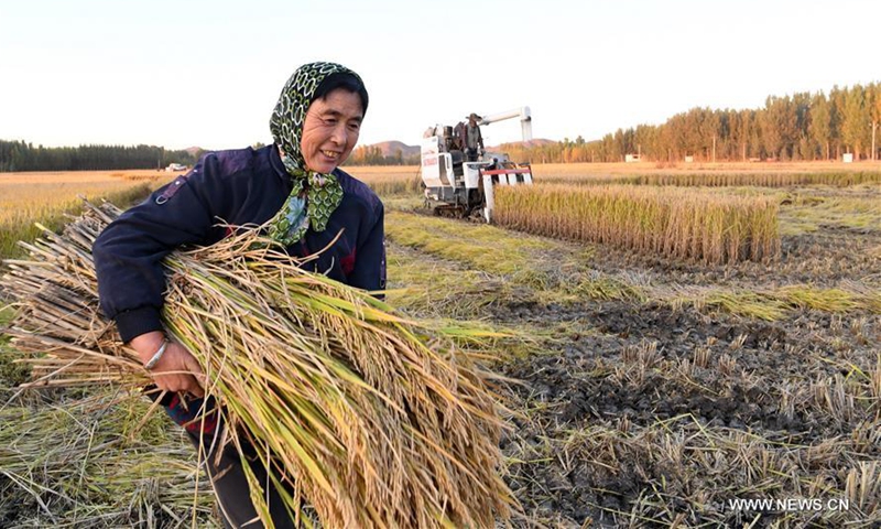 A farmer harvests rice in Jiangzhuang Village in Luanzhou, north China's Hebei Province, Oct. 18, 2020. (Xinhua/Mu Yu)