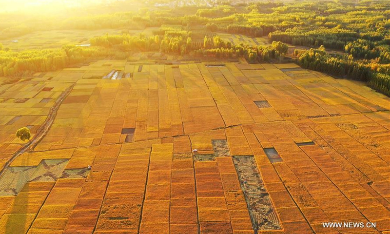 Aerial photo taken on Oct. 18, 2020 shows rice fields in Jiangzhuang Village in Luanzhou, north China's Hebei Province. (Xinhua/Mu Yu)