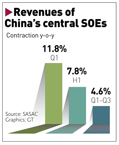 Revenues of the central SOEs grew 1.5 percent year-on-year to 7.8 trillion yuan ($1.17 trillion) in the third quarter. In the first three quarters of the year, cumulative revenues of central SOEs were down 4.6 percent year-on-year to 21.1 trillion yuan, Peng Huagang, a spokesman for the State-owned Assets Supervision and Administration Commission of the State Council (SASAC), told a news conference.