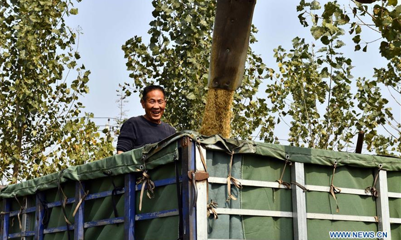 A farmer harvests rice crops in Pizhuang Township of Taierzhuang District of Zaozhuang City, east China's Shandong Province, Oct. 21, 2020.Photo:Xinhua