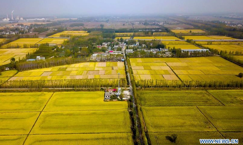 Aerial photo taken on Oct. 21, 2020 shows a harvester reaping rice crops in Pizhuang Township of Taierzhuang District of Zaozhuang City, east China's Shandong Province.Photo:Xinhua