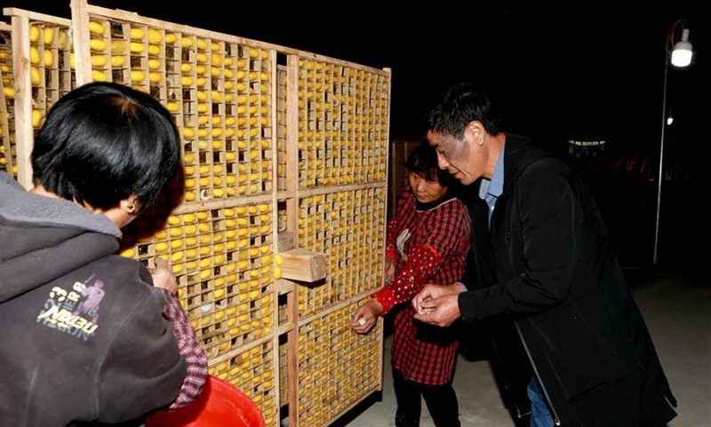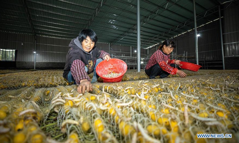 Farmers put silkworms onto cocoon frames in Xidong Village of Kaihua County, east China's Zhejiang Province, Oct. 21, 2020. Silkworm farmers of Xidong Village have significantly improved profitability after cooperation with sericulture companies and scientific researchers began in 2018. By the end of 2020, the village's silk production is estimated to reach 22,500 kilograms, which could increase farmers' income by nearly a million yuan (about 150,000 U.S. dollars). (Xinhua)