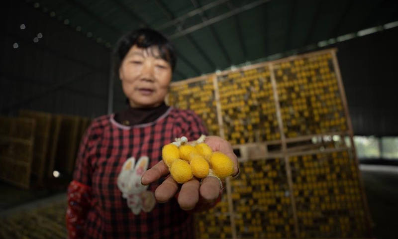 A silk farmer shows harvested silkworm cocoons in Xidong Village of Kaihua County, east China's Zhejiang Province, Oct. 21, 2020. Silkworm farmers of Xidong Village have significantly improved profitability after cooperation with sericulture companies and scientific researchers began in 2018. By the end of 2020, the village's silk production is estimated to reach 22,500 kilograms, which could increase farmers' income by nearly a million yuan (about 150,000 U.S. dollars). (Xinhua)
