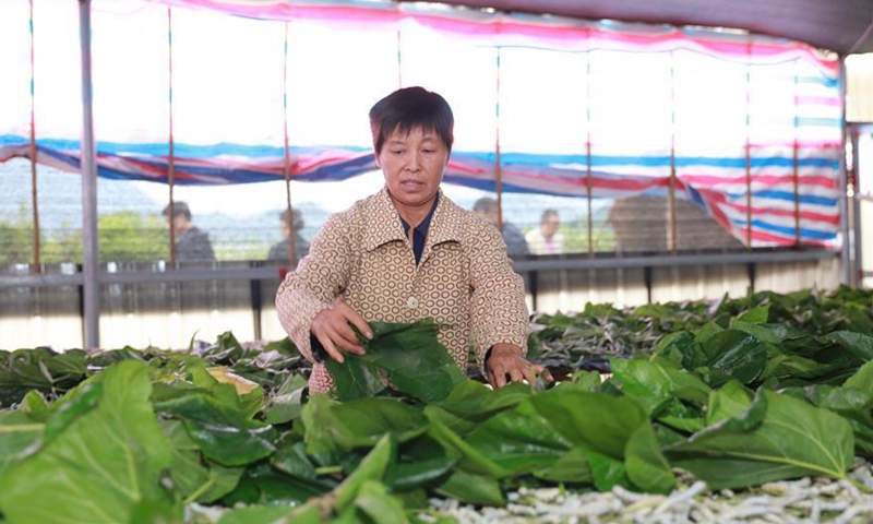 A farmer feeds silkworms with mulberry leaves in Xidong Village of Kaihua County, east China's Zhejiang Province, Oct. 21, 2020. Silkworm farmers of Xidong Village have significantly improved profitability after cooperation with sericulture companies and scientific researchers began in 2018. By the end of 2020, the village's silk production is estimated to reach 22,500 kilograms, which could increase farmers' income by nearly a million yuan (about 150,000 U.S. dollars). (Xinhua)