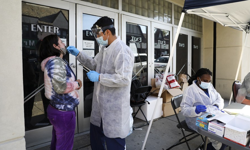 A woman gets COVID-19 test at a makeshift test site in Kew Gardens, one of the COVID-19 hotspot areas in New York City, the United States, Oct. 6, 2020. Photo:Xinhua