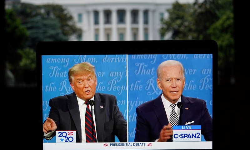 Photo taken in Arlington, Virginia, the United States, on Sept. 29, 2020 shows C-SPAN 2 live stream of U.S. President Donald Trump (L) and his Democratic challenger, Joe Biden, speaking during their first debate in the 2020 presidential race.File photo:Xinhua