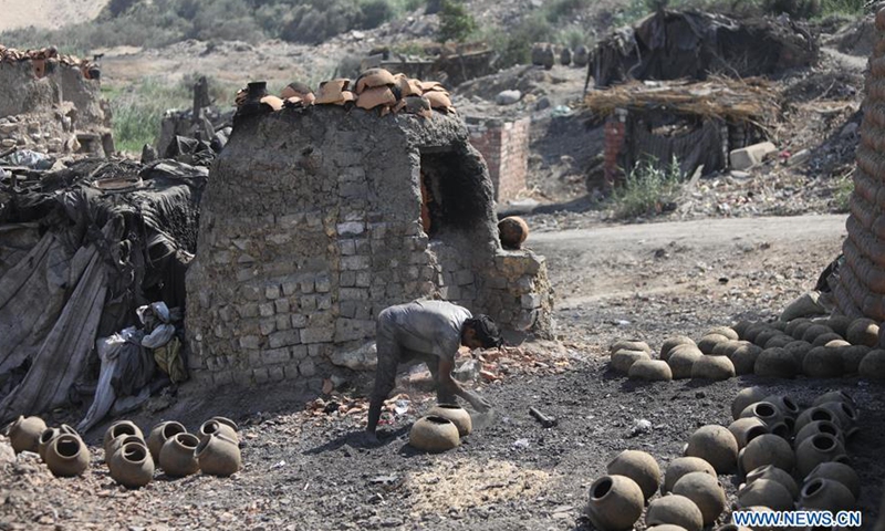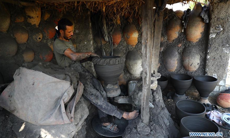 A potter works in Nazla village in Fayoum, Egypt, on Oct. 5, 2020. The Nazla village of Egypt's Fayoum governorate has been famous for its potters who keep the ancient Egyptian pottery making techniques alive.Photo:Xinhua
