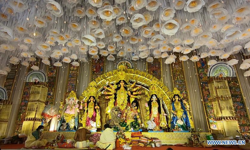 People worship at an almost empty Durga Puja pandal on the night of Maha Ashtami during the COVID-19 pandemic in Kolkata, India, Oct. 24, 2020. (Str/Xinhua)