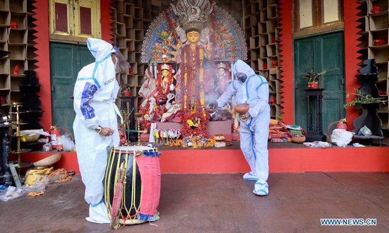 People wearing personal protection equipment (PPE) kit takes part in the ritual at a Durga Puja pandal amid the COVID-19 pandemic in Kolkata, India, Oct. 25, 2020. (Str/Xinhua)