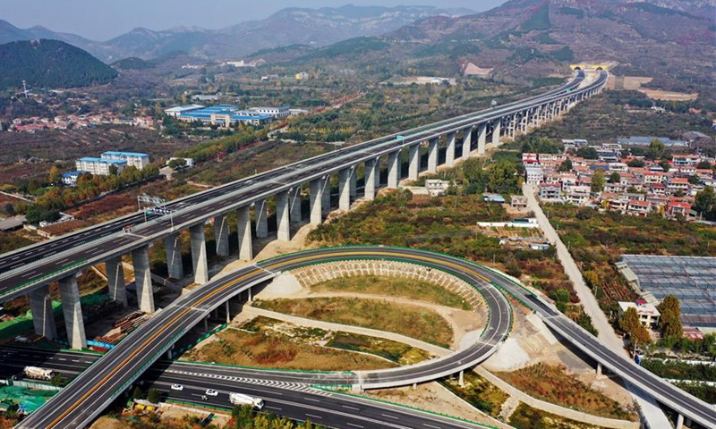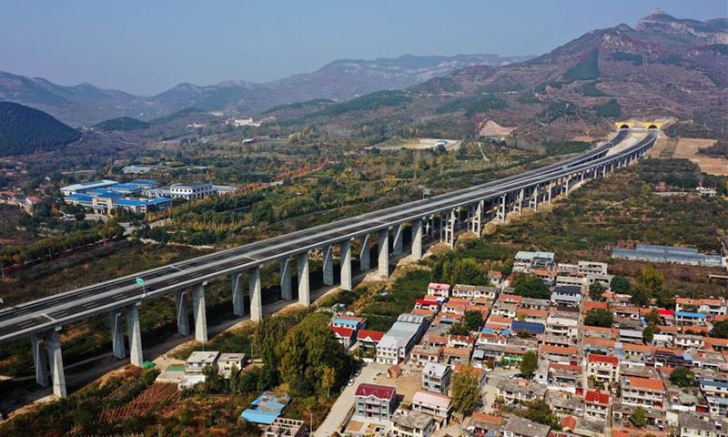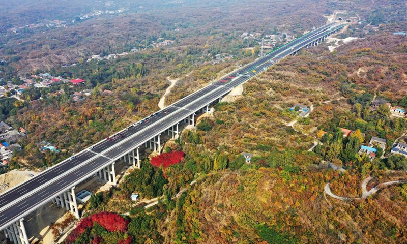 Aerial photo taken on Oct. 26, 2020 shows the Jinan-Tai'an expressway in east China's Shandong Province. The expressway linking Jinan and Tai'an in east China's Shandong Province will be put into operation soon. The expressway will shorten the travel time between the two places to half an hour after its operation. (Xinhua/Xing Guangli)