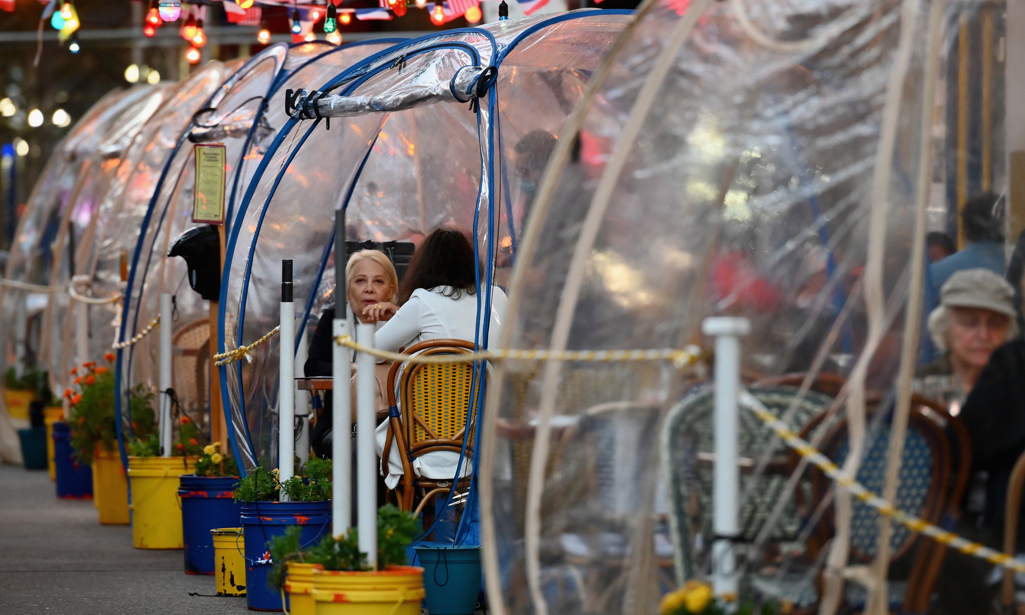 People dine in plastic tents at a restaurant in Manhattan in New York City on Thursday, amid the coronavirus pandemic. Photo: AFP