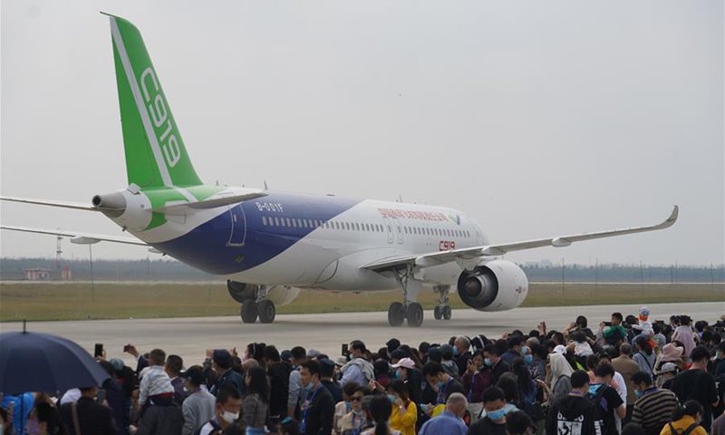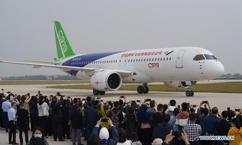 China's C919 jet is seen during the 2020 Nanchang Flight Convention at Yaohu Airport in Nanchang, capital of east China's Jiangxi Province, Oct. 31, 2020. The C919, China's first home-developed trunk jetliner, conducted a successful maiden flight in 2017. The aircraft has begun intensive test flights from various airports to ensure it meets all airworthiness standards. (Xinhua/Zhou Mi)