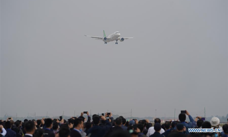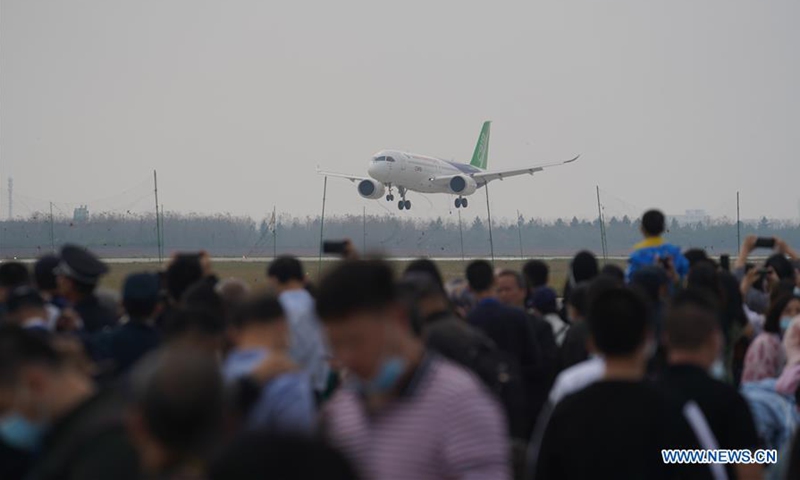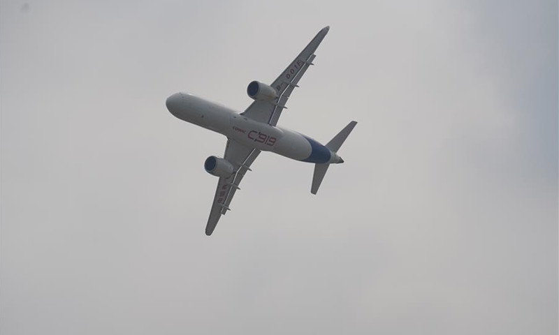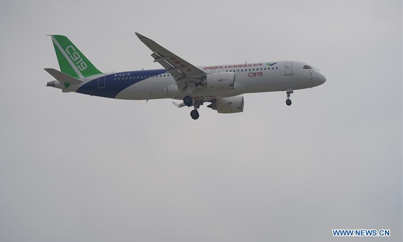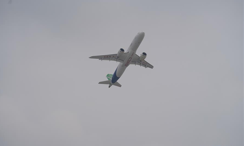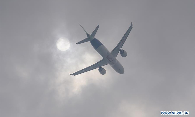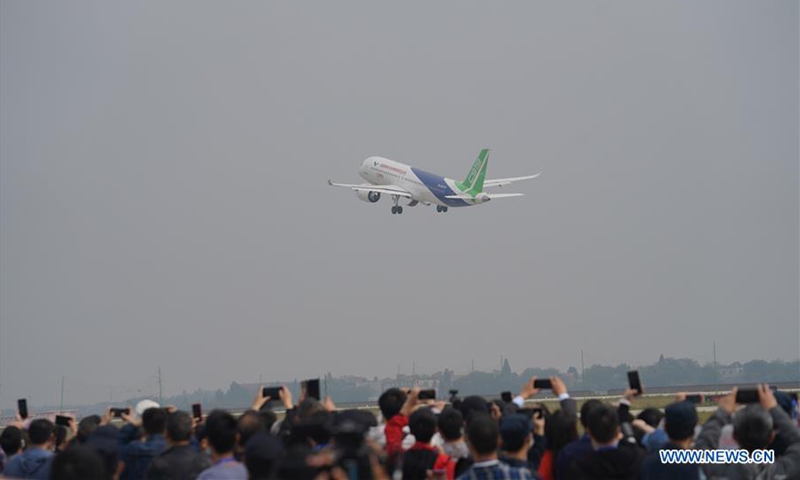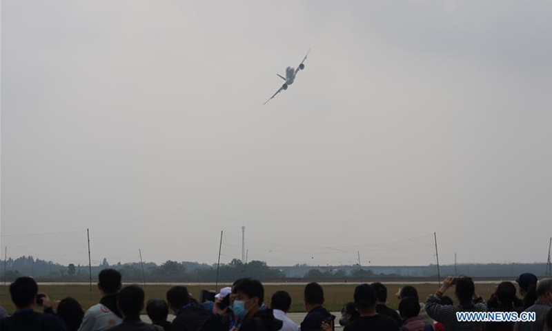China's C919 jet performs in an air show during the 2020 Nanchang Flight Convention at Yaohu Airport in Nanchang, capital of east China's Jiangxi Province, Oct. 31, 2020. The C919, China's first home-developed trunk jetliner, conducted a successful maiden flight in 2017. The aircraft has begun intensive test flights from various airports to ensure it meets all airworthiness standards. (Xinhua/Zhou Mi)
