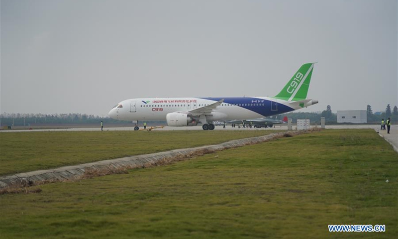 China's C919 jet taxis on the runway during the 2020 Nanchang Flight Convention at Yaohu Airport in Nanchang, capital of east China's Jiangxi Province, Oct. 31, 2020. The C919, China's first home-developed trunk jetliner, conducted a successful maiden flight in 2017. The aircraft has begun intensive test flights from various airports to ensure it meets all airworthiness standards. (Xinhua/Zhou Mi)