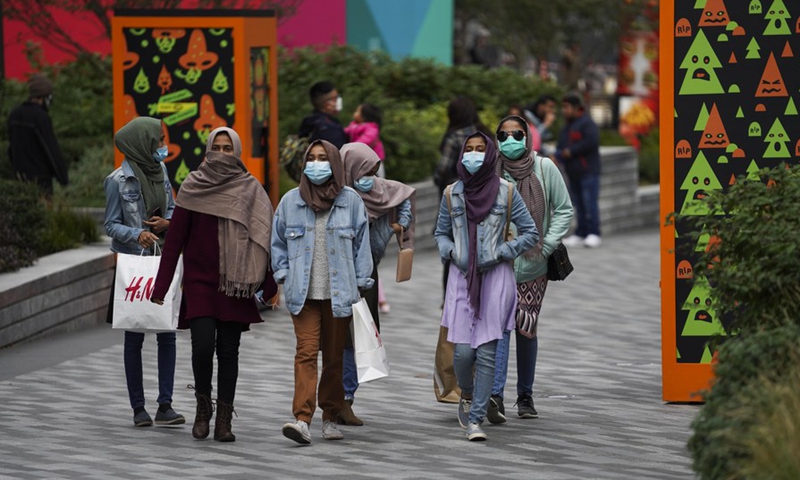 Pedestrians walk on a square in New York, the United States, Oct. 25, 2020. (Xinhua/Wang Ying)