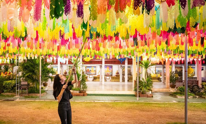 A girl hangs a lantern at the Wat Phra That Hariphunchai in Lamphun, Thailand, Nov. 1, 2020. About 100,000 lanterns are hanging in the Wat Phra That Hariphunchai as part of the celebration of the traditional Yi Peng festival. (Xinhua/Zhang Keren)