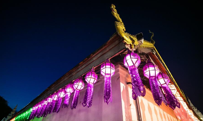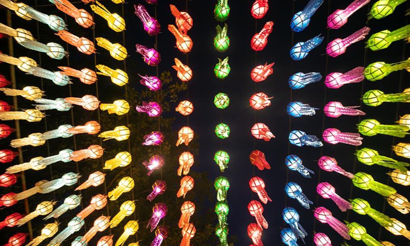 Colorful lanterns are seen at the Wat Phra That Hariphunchai in Lamphun, Thailand, Nov. 1, 2020. About 100,000 lanterns are hanging in the Wat Phra That Hariphunchai as part of the celebration of the traditional Yi Peng festival. (Xinhua/Zhang Keren)