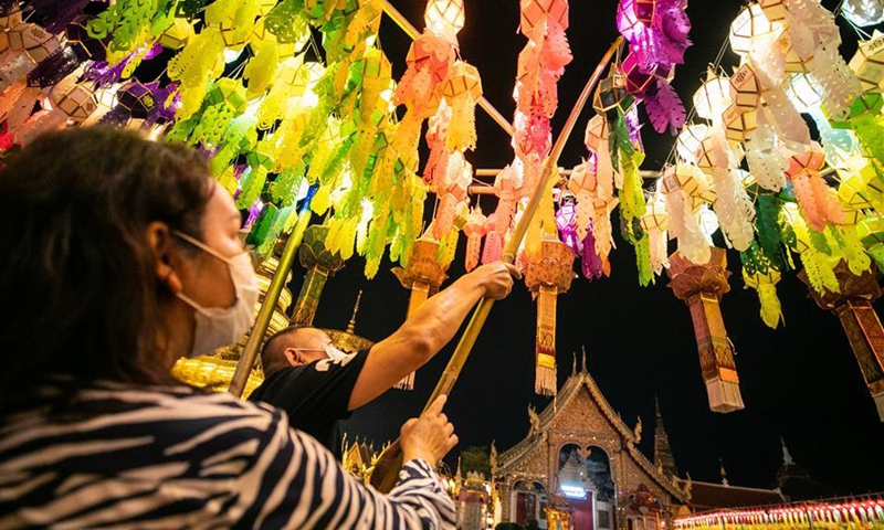 People hang lanterns at the Wat Phra That Hariphunchai in Lamphun, Thailand, Nov. 1, 2020. About 100,000 lanterns are hanging in the Wat Phra That Hariphunchai as part of the celebration of the traditional Yi Peng festival. (Xinhua/Zhang Keren)