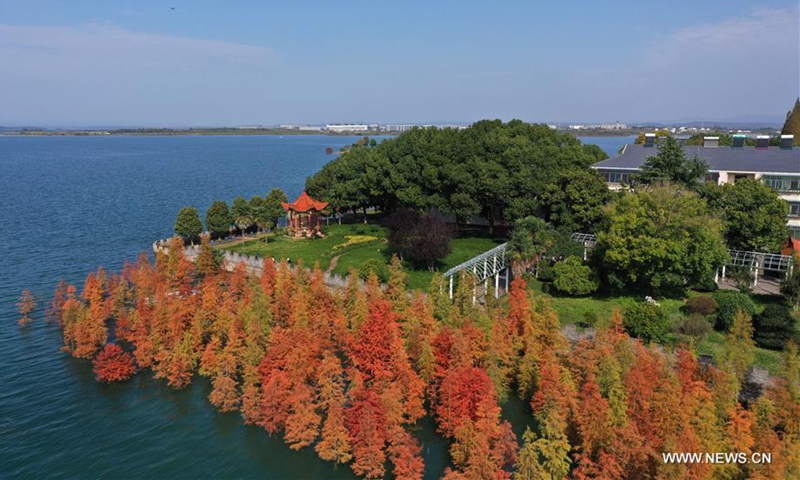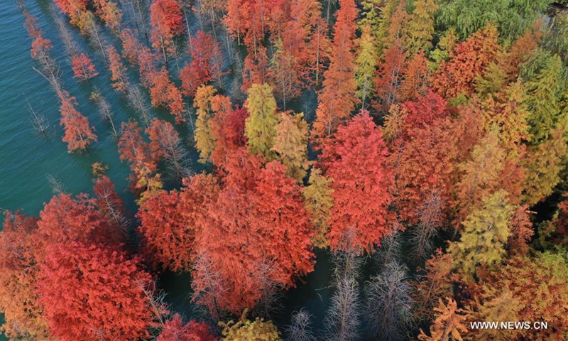 Aerial photo taken on Nov. 2, 2020 shows a view of a dawn redwood forest in Zhanghe Reservoir of Jingmen City, central China's Hubei Province. (Photo by Peng Qi/Xinhua)