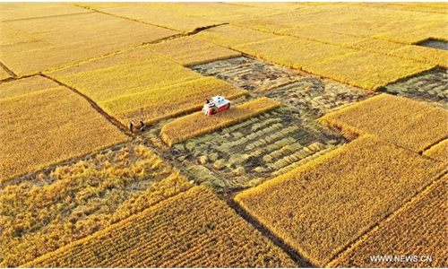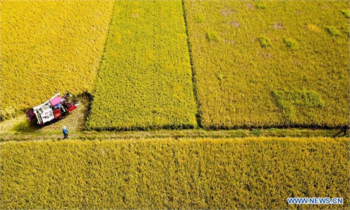 A working staff drives a tractor to harvest the third-generation hybrid rice at a demonstration base in Hengnan County of Hengyang City, central China's Hunan Province, Oct. 21, 2019. (Xinhua/Chen Zeguo)