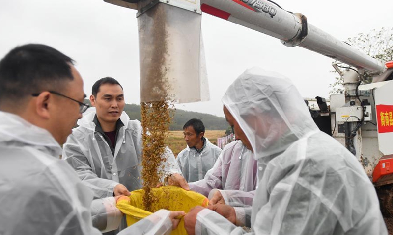 Staff members bag the third-generation hybrid rice at an experimental demonstration field in Hengnan County, central China's Hunan Province, Nov. 2, 2020. The third-generation hybrid rice developed by Yuan Longping, the "father of hybrid rice," and his team achieved a yield of 911.7 kg per mu (about 667 square meters) in an experiment in central China's Hunan Province. (Xinhua/Chen Zeguo)